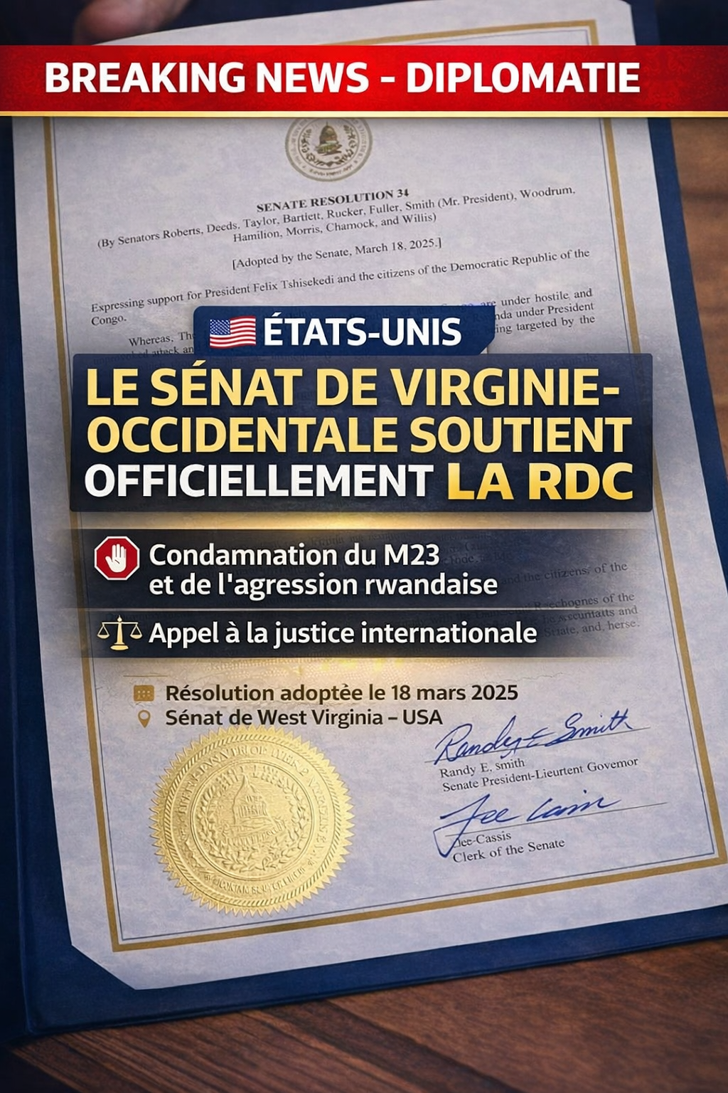 L’adoption, le 18 mars 2025, d’une résolution officielle par le Sénat de l’État américain de Virginie-Occidentale marque un tournant politique et moral majeur dans la reconnaissance internationale de la vérité sur la situation sécuritaire en République démocratique du Congo.